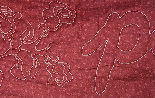 The problem? They don't quite fit the design of the rest of the quilt. They are dense, detailed and semi-realistic roses. The rest of the quilt is open curves...outline quilting, wonky spirals, big cursive words. Those prolific roses up against the spacious words...just not working for me. (We're not even going to discuss thread choice. Learning about that one from observation, not correction, on this quilt.)